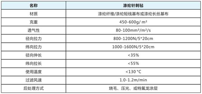滌綸針刺氈是采用非織造工藝利用纖維交錯排列,空隙分布均勻的細纖維布,以滌綸短纖維與滌綸有捻紗所生產的針刺氈,表面經熱軋、燒毛或涂層等后處理,使其表面平整光滑,不易被粉塵所堵塞,此濾料空隙率大,透氣性能較好,用途極為廣泛,抗化學穩定性強,不僅可以過濾常溫氣體,而且可過濾含有酸堿的腐蝕性氣體,并可濾水、濾油,是常溫工況。液固分離等領域理想的過濾材料。
