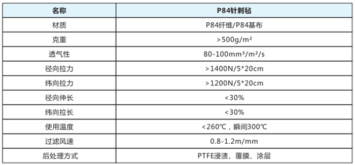 P84針剌氈采用奧地利LENZING公司所生產的P84纖維(即聚酰亞胺)經三維針刺而成,具有很好的耐高溫性能,耐溫達280℃,且P84纖維截面呈不規則葉狀,可以大大提高過濾效果,纖維本身還有一定的抗水解、抗氧化性,該產品耐溫性好、過濾效果好、廣泛地適用于混凝土攪拌、水泥、垃圾焚燒、燃煤鍋爐等復雜工況條件下使用。
